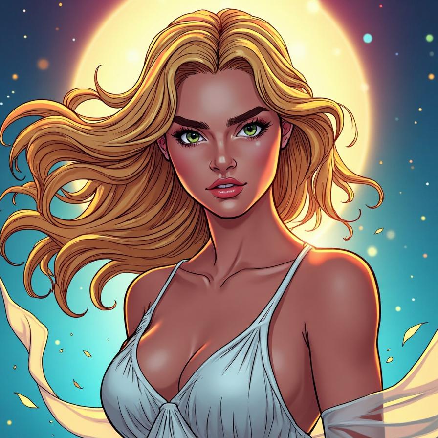 goddess Aphrodite, looking at the camera, greeny grey eyes, darker eyebrows, blonde hair