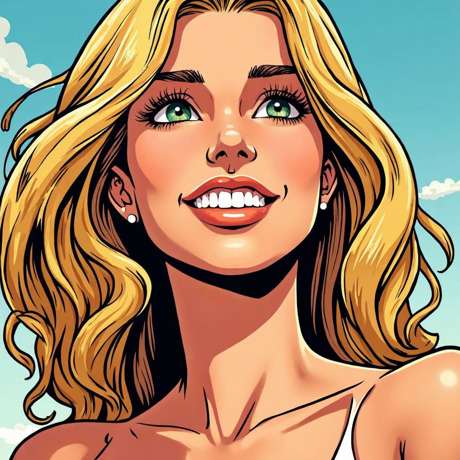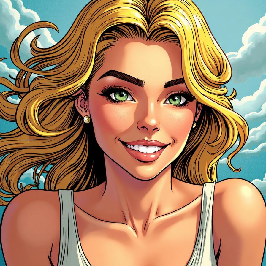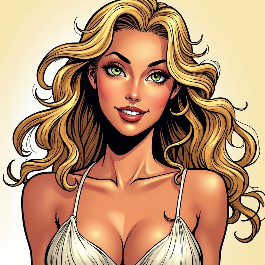 goddess Aphrodite, looking at the camera, greeny grey eyes, blonde hair, smiling, top teeth showing, horizontal but arced brown eyebrows, 34B breasts, belly button view with face, wearing a boob tube.